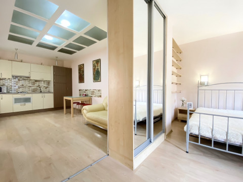 Славна нова 1но кімнатна квартира в Каретному провулку, 7, ріг вул. Толстого. 10-15 хвилин пішки до Дерибасівської Вхід з вулиці через ворота на коді, потім ще одні двері – вхід в маленький дворик на кілька квартир. Квартира розташована на 1ом поверсі, загальна площа 35м2, висота стелі 2,7 м. При вході в квартиру потрапляємо в передпокій, з неї зліва кухня, прямо – санвузол. З кухні вихід в спальню. Кухня 15м2в ній кухонні меблі, обідній стіл і стільці, розкладний диван. Спальня 14м2 в ній велике ліжко, шафа, письмовий стіл, великий ТВ. Вікна спальні виходять у маленький дворик з квітами. Квартира обладнана: холодильник, кондиціонер, Інтернет wi fi, телефон, LCD ТВ 32 " з кабельним телебаченням, пральна машинка. Санвузол суміщений, в ньому кутова ванна, умивальник, туалет. Максимальне розміщення 4 людини. Парковка не охороняється на вулиці або під охороною на вулиці Ковальській.